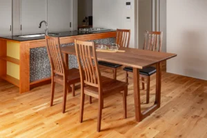 シンプルに見えますが角のすべてに面取りを施すなど、要所に職人技が光るテーブルです。同シリーズのハイバックチェアやベンチとコーディネートすれば、空間が特別な物にアップグレードするでしょう。