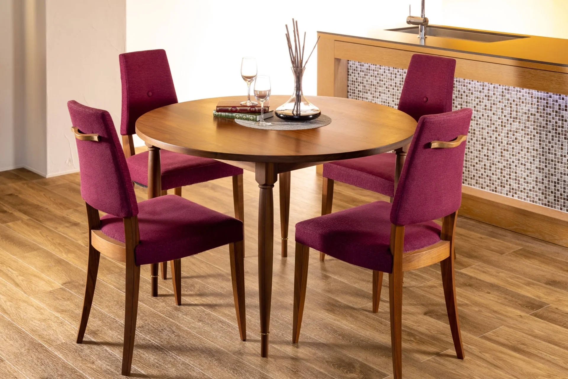 北欧家具を思わせる細身のフレームと美しい木目が特徴のチェアは、なんともシャルドネらしい一品です。選べる樹種は4つ、ファブリックは20以上用意されているので、さまざまな空間にマッチします。
