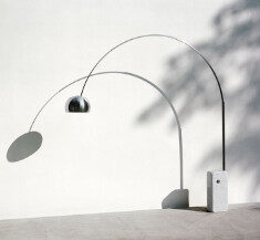 Arcoは、大理石ベースとアーチ状の長いアームで構成された、アイコニックなフロアランプです。1962年にカスティリオーニ兄弟によってデザインされ、シンプルながらも存在感のある構造美が今も世界中で愛されています。電源をベースに内蔵せず、ソケット部までコードを通すという発想も斬新で、天井工事なしで空間を照らせる実用性も人気の理由です。中古市場では、シェードの状態が良好なものは高値で取引される可能性があります。