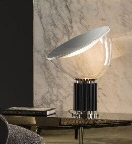 なかでも「アルコ(Arco)」は、大理石の土台から美しいアーチを描くフロアランプで、名作として世界中に知られています。「IC Lights」シリーズは、繊細なバランスでガラス球を支えるデザインが美しく、ホテルやラウンジでも人気です。