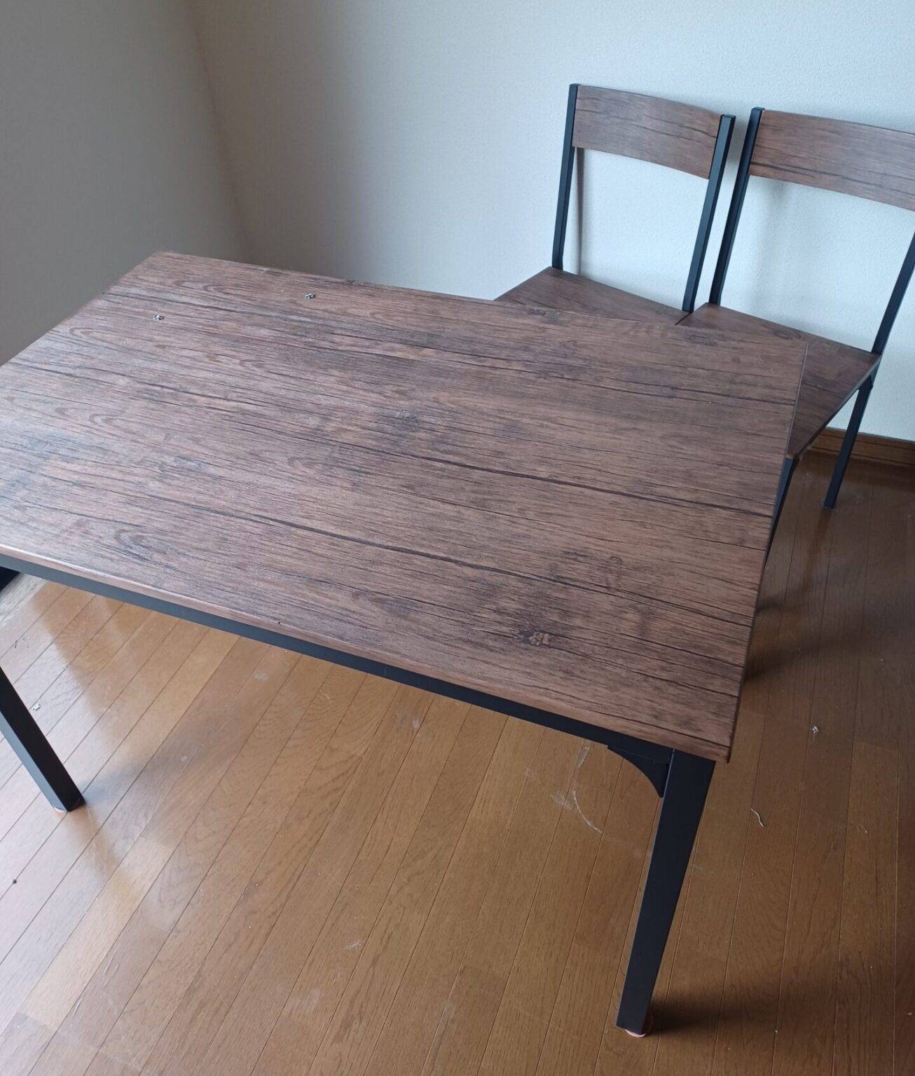 拝見したコーナンオリジナルのダイニングセットは、天板に日常使用によるわずかなスレは見られたものの脚部のぐらつきや大きな傷はなく、チェアも良好な状態でした。
